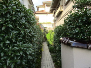 ツバキの生垣、クロガネモチで段物の剪定です。