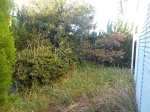 雑草は草刈り機を使用し、飛石などで家を傷つけないよう