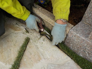 人工芝を敷設し、淵沿いをハサミ、カッターナイフを使用しカットしていきます。